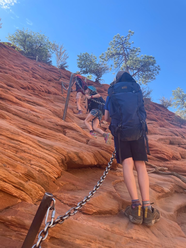 Whoo-hoo. We hiked Angel’s Landing at Zion National Park today. This was a stretch for us. (Angel’s Landing is a 5 mile out and back hike with 1 mile of rock scramble to reach the pinnacle. Popular enough you have to have a permit. After missing the early lottery last spring for a permit, I scored one yesterday in my first day before attempt.). My oldest and my husband decided not to join us. Oh wow, it was fantastic. The 10 year old started off grumpy, picking on siblings etc., etc. and I took my own advice, took a breath, looked around and Wow it is beautiful. It provided enough space for me to ask the 10 year old why he was grumpy. He didn’t have a good night sleep and that provided enough connection that he settled out after that. Then on the way back down, he took off way ahead by passing a message through his siblings about his plan. Oops, that led to a couple meltdowns that I was able to acknowledge and validate. Also, not freak out about the fact I basically lost a child and calmly take care of Mom as we sat down for lunch even though I didn’t know exactly where the 10 year old was. I was starving. And one 7 year old cried the last quarter mile because her legs hurt and she didn’t want to go any further. We were on the hottest part of the trail (100 degrees today by the time we finished) and we couldn’t stop. (Mom wouldn’t have started again.) I acknowledged, validated and accepted the crying and promised her when we got to the bridge I would carry her. I couldn’t carry her farther. Once she laid down a little waiting for the shuttle bus back to the car she rebounded. And now we get to say look what we did. Oh and the other 7 year old got her black bear, but it was her turn to I could say yes.